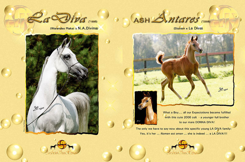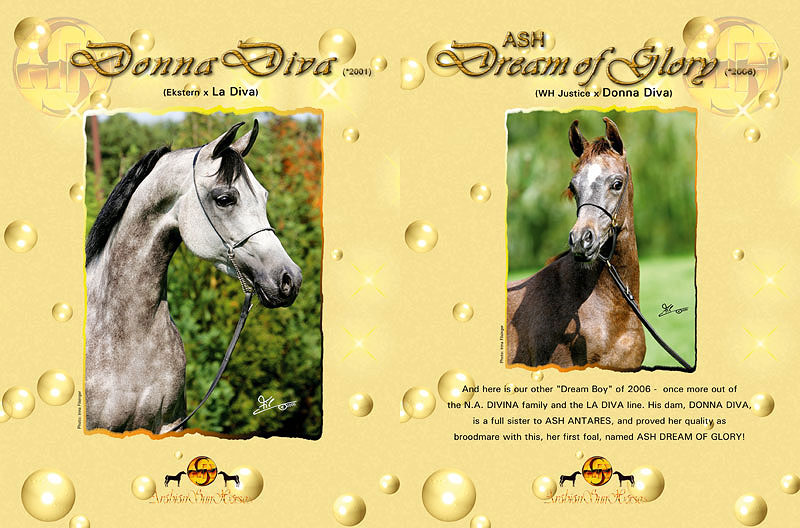 However, good colts are also important! In 2006, two really special colts have been born at ASH, both coming from the LA DIVA family: her son, ASH ANTARES (by Ekstern), a younger full brother to broodmare DONNA DIVA, and her son, ASH DREAM OF GLORY (by WH Justice).