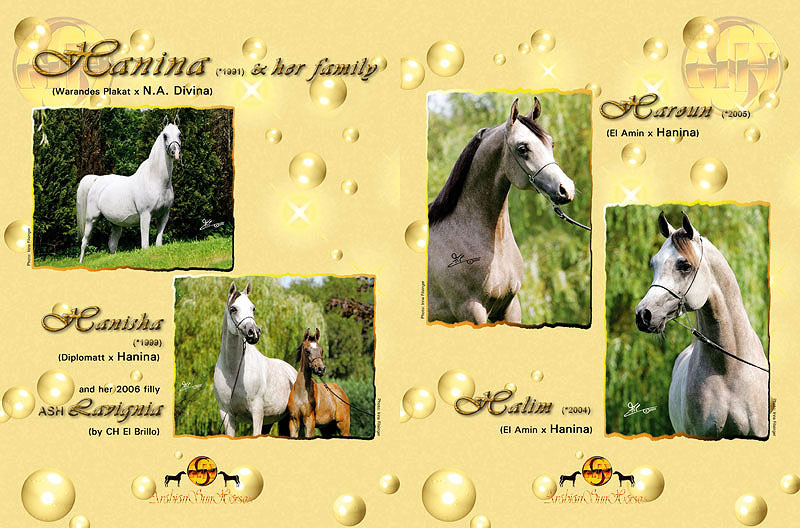 HANINA (*91), DAHMA (*93), and LA DIVA (*95) - all retained at ASH as broodmares. This group of daughters was further enhanced by another daughter of N.A.DIVINA, the 2005 born, very lovely and exotic DOUNIA (by WH Justice).
