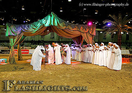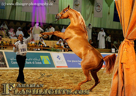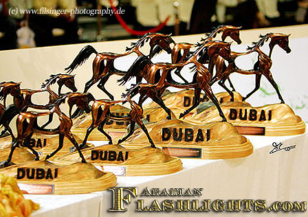 For horse people all over the world, for many years Dubai is already known for the most prestigious and famous "Dubai World Cup", the big flatracing meeting in April each year, with a prize money of one million U.S.Dollars. The Dubai World Cup attracts the best racing horses flown in to participate and compete in this most prestigious racing. No wonder, that sooner or later, the Dubai people would discover the Arabian horse shows and start another new field to follow up in halter shows what Dubai has already setup in flat racing. And they did!