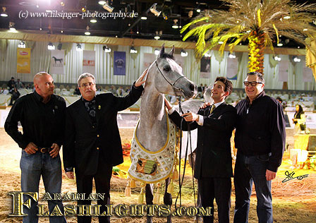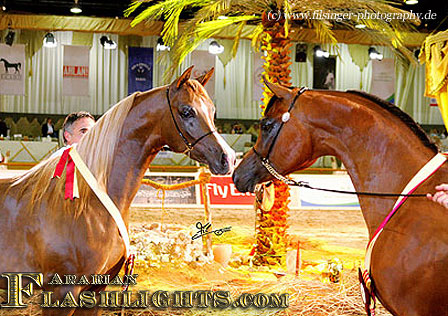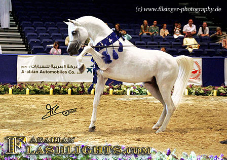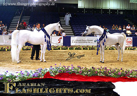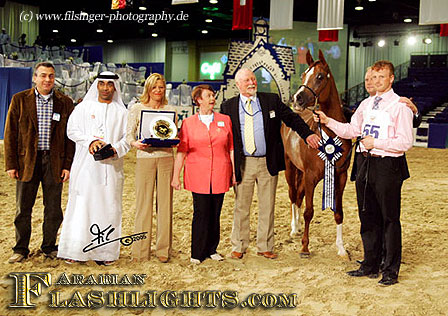 In 2004, the Dubai International Arabian Horse Championships (DIAHC) started up and had it's first experiences. Held indoor in the Dubai World Trade Center (DWTC) in the city of Dubai, the second year the DIAHC Committee added an international equine affairs and exhibition next door to the show. Another major and most impressive new step in 2005, the DIAHC Committee invited a group of most successful horses of the preceeding European shows to come over and to compete at the Dubai International Show. Whow - what a chance for some Europeans, and several of the invited horses and owners took the once in a lifetime chance, flying in March from the cold European winter to very convenient summer climate in the Middle East. Not only were all costs for this journey paid for by the DIAHC Commitee, but additionally there were also some magnificent prizes placed for the champions of this show: a car for each champion, and each reserve! One of the happy winners was the Despeghels of Dion Arabians, Belgium, winning a Porsche Cayenne, and the Jones family, from Wales, Great Britain, who ended up with a car at the DIAHC 2005 - ETERNITY IBN NAVARRONE won Champion Stallion, and the three-year-old chestnut HANIYYAH Reserve Champion Filly.