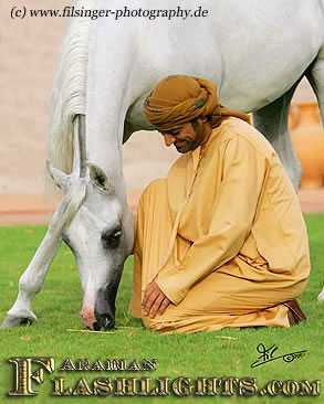 However, every afternoon when at home in the emirate, Sheikh Ammar takes a visit to his horses and studfarm if his busy time as the Crown Prince and Heir Apparent of the emirate 'Ajman' allows him to do so. And he enjoys every moment there. Sitting in the inner court of his little private paradise, he likes to welcome friends, visitors and horse enthusiasts from all over the world who want to see Ajman Stud and it's horses. Sheikh Ammar is always gentle to offer this opportunity.