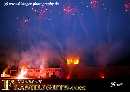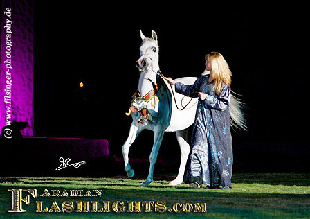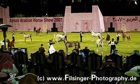 The Ajman show is an excellently organized Arab horse show, but also a local event and spectacle in Ajman and the country, not only for horse people but for all. During the last day of show, immediately before the final championship results are announced, exciting presentations are offered to the audience. The grandstands during this last day are always full, including horse experts but also many, many local people come to enjoy this event created around the Arabian horse. In 2007, it was a fascinating fire, laser and music show, a classical Arab music, singing and dancing group, a ridden presentation with two equine acrobats, and a very lovely and glamourous presentation in spotlights of Sheikh Ammar's brand new 2006 World Champion Filly, Bess-FAIZAH.