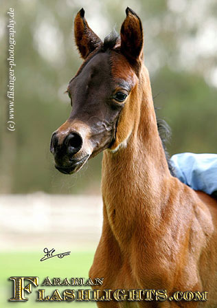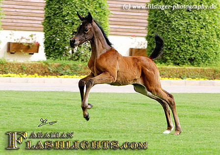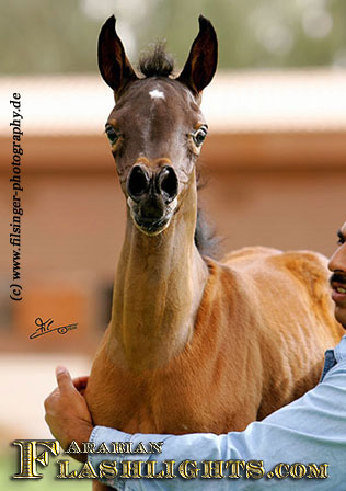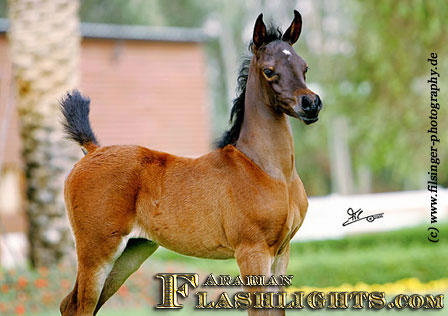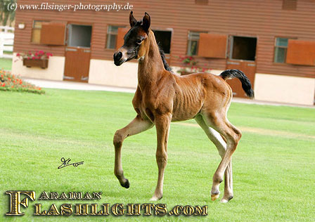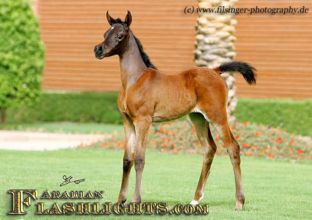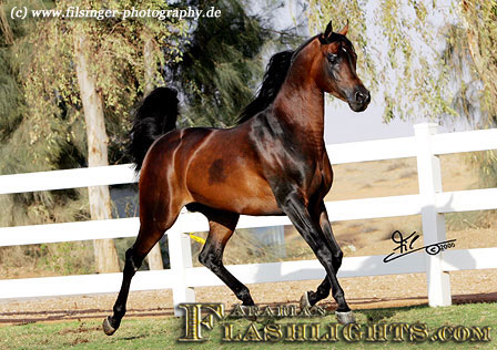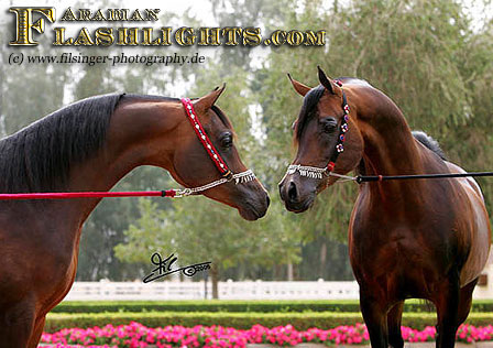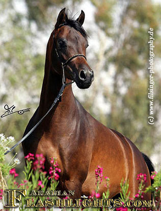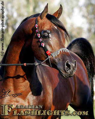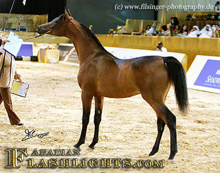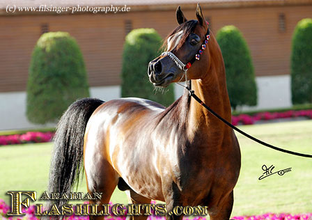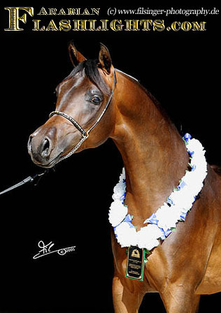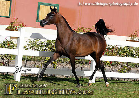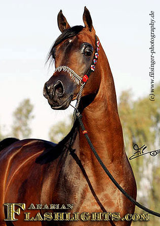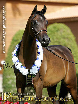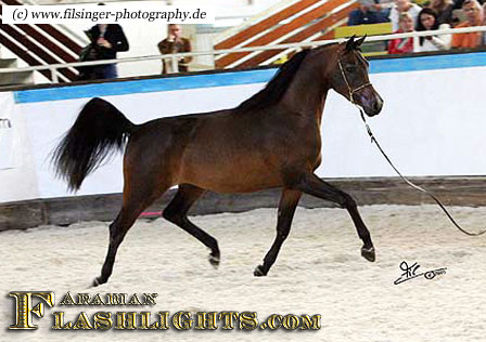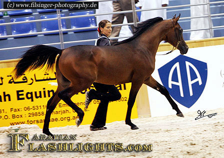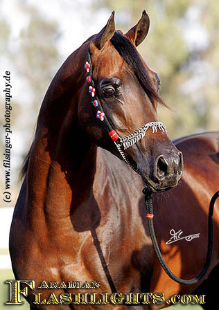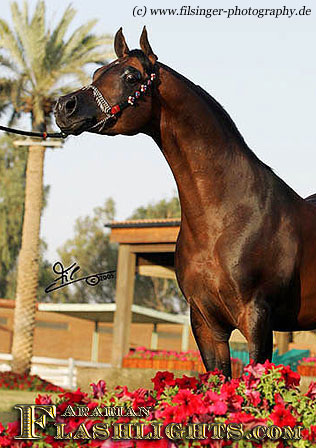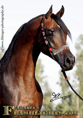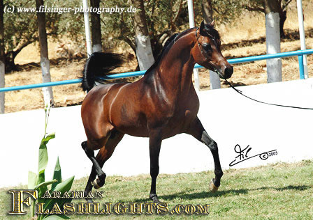 Flying to the desert of Saudi Arabia, AJA SANGALI found a beautiful place as his new home. And a broodmare base, that gave him a lot of opportunities to establish himself as a sire. And since he started to bred mares in 2002, he has produced some very good foals. One of the most well known is the 2003 born MOUTAZ Al Buwibiya, a chocolate dark bay out of Premirra (by Perlanes Premier). MOUTAZ was shown in the Near and Middle East, and in Europe in 2004 /2005, and made a reputation for himself as well as for his sire by winning many championship titles in these years.