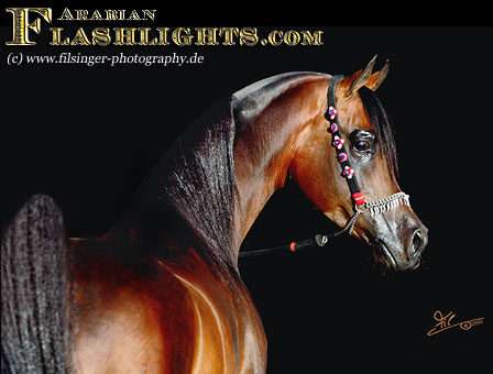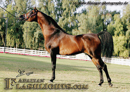 AJA SANGALI was one of the very first progeny of his sire, FS BENGALI, a KUBINEC son out of the SANADIK EL SHAKLAN daughter OM EL SANADIVA, who was World Champion Filly as a three-year-old. FS BENGALI was also shown successfully himself many times, both by his breeder, and longtime owner and shareholder of the stallion, the professional trainer Frank Spönle, from Germany, anmd also the Hickfords of AJA Arabians, who had been a shareholder in the FS BENGALI partnership. It was arranged, that BENGALI was to come to England every second year to breed the mares over there. And this was how AJA SANGALI was produced, like his younger full brother, the also successful AJA SANAGOR, now sold to Egypt.