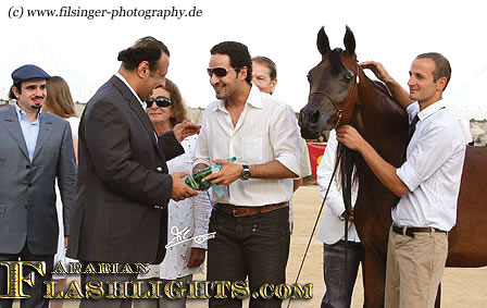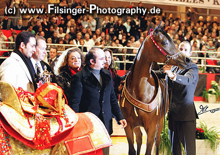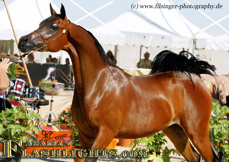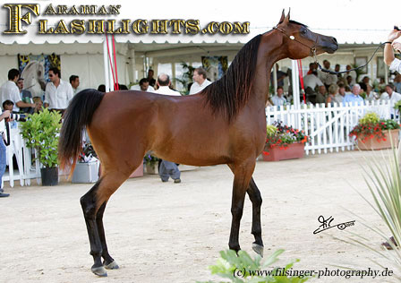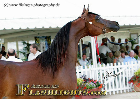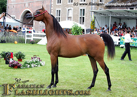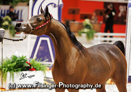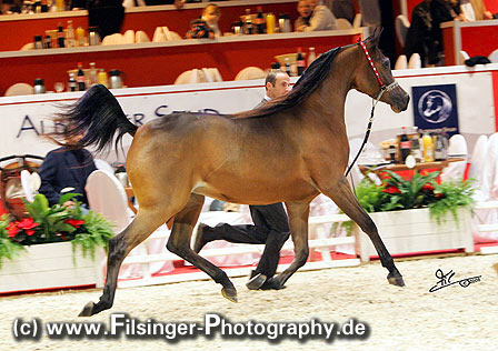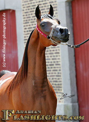 ABHA PALMA is one of those fillies which immediately catches you attention. When she was at the Menton 2008 show, she was presented the evening before the show to her new owner, HH Prince Abdullah bin Fahad Al Saud, from the Al Mohamadiah Stud, in Saudi Arabia, and all people standing around were immediately captivated. She is only two years old, but very showy and has tremendeous potential. Her long and very elegant neck which she uses like a swan, and the overall balance is very impressive. When she poses, she is one of those "look at me" horses, and you may think she is just born for this.