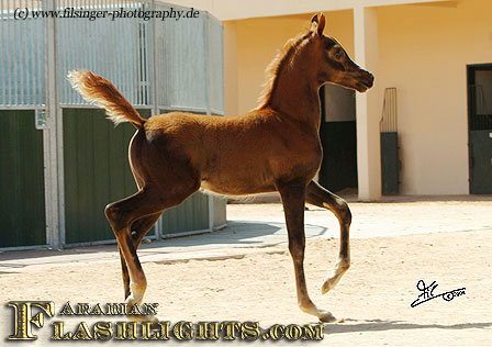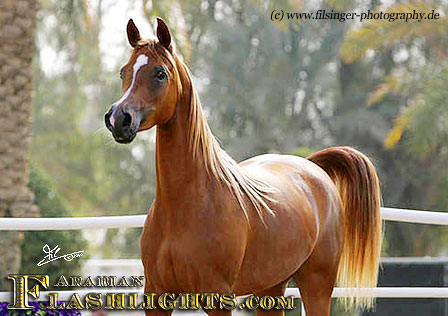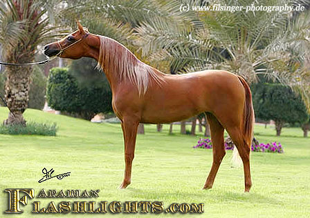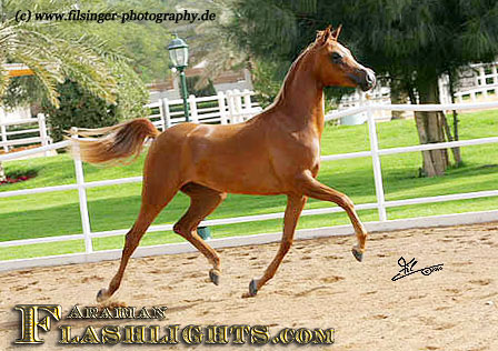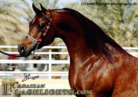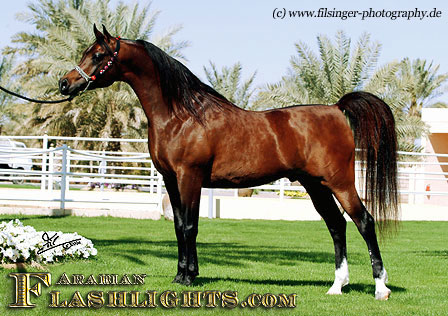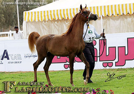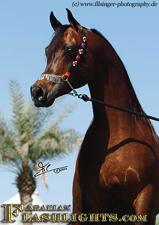 Once in his new country Saudi Arabia, BJ THEE MUSTAFA had still not arrived at his final home. It is a very common habit in the Middle East to make very special and valuable gifts to the higher ranked royalties or rulers to please them and show them high respect. So it happened in October 1999 that the famous and world wide known Arab stallion BJ THEE MUSTAFA came gifted to the HRH Prince Abdullah, who was Crown Prince od Saudi Arabia at that time and is the today's Majesty, King Abdullah. In his 'Stables of King Abdullah & Sons', BJ THEE MUSTAFA found his final home. In this lovely stud farm's place and in very nice care he stands row in row next to other famous stallions and major champions from Europe like KORONEC, TALADINN, MONITOR, and the dark bay, homebred, 2005 Saudi National Champion, the most promising SAABA AL SAHRA.