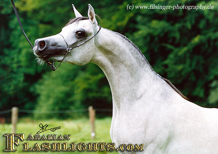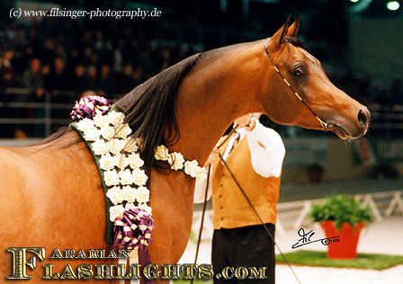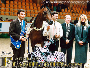 In Europe, he was a new comer in both - the THEE DESPERADO blood that was not very much represented at this time, and in the show ring. Until 1997, BJ THEE MUSTAFA was shown several times, each time with good success and top ranking in his individual age class. His major success came in 1998, when he succeeded as a five-year-old in the prestigeous 'Triple Crown' - namely Champion Stallion of the All Nations Cup, the European Championships, and the World Championships in one and the same year. Everybody spoke about BJ THEE MUSTAFA because his quality and class, and the firey spirit he sometimes displayed. During his competition in Paris in 1998, a Saudi delegation attended headed by Mutlaq Ben Mushrif, who saw MUSTAFA and offered before the finals such a big price that his owner could not refuse. BJ THEE MUSTAFA was sold to the Kingdom of Saudi Arabia and HRH Prince Sultan Bin Abdul Aziz Al Saud, son of His Majesty, the late King Fahd, and was awarded World Champion Stallion with the old and the new owners. He left Europe to the desert, leaving a few first foals in Europe behind as well as a few mares infoal. The most well known European descendants of BJ THEE MUSTAFA might be the Champion Filly THEE RAHIBA in Italy (out of HMT Farimah/ by The Minstril), and the 1999 born, black stallion DUBAI PASHA (out of Abas Pasha I-11), bred by Fontanella Magic Arabians, Italy, standing in Germany.