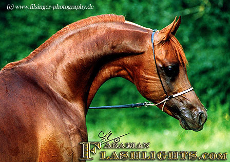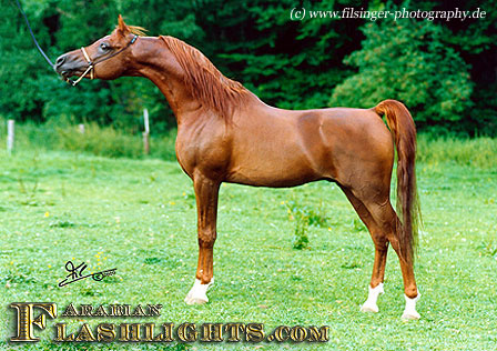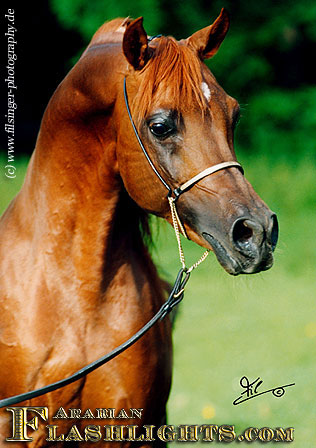 The chestnut DIPLOMATT was a yearling colt at that time, and presented for him at the Egyptian Event in Lexington. He comes from the combination of the 1991 World Champion Stallion, straight Egyptian SIMEON SHAI, out of the Spanish mare AVILA. And indeed, DIPLOMATT reflects the touch of both, and carries the stamp of both bloodlines, his sire as well as the Spanish look with the big dark eyes and the solid body.
