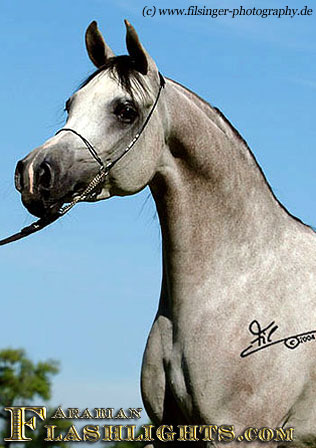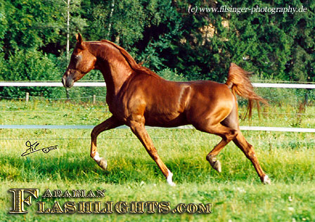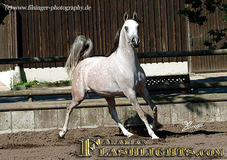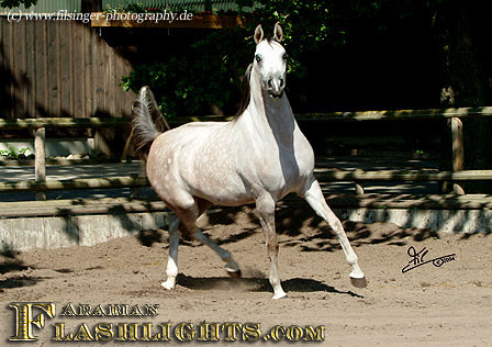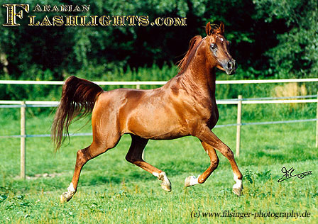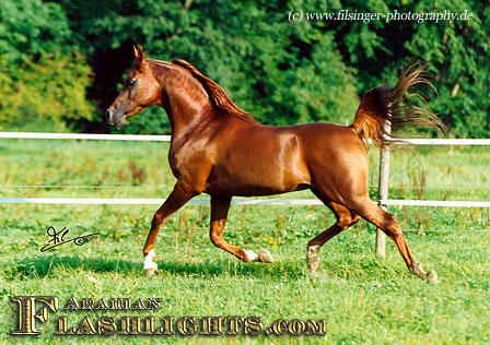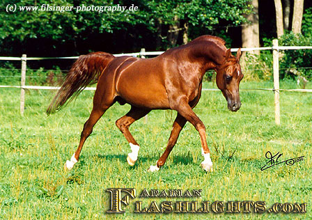 The 1999 born DIPLOMATT daughter HANISHA (out of Hanina) reflects the same great movements as her sire, being full of action and power. She was bred by 'Arabian Sun Horses' and was recently sold to 'Mirage Arabians' of Sally Roberts, in Wales, Great Britain,
