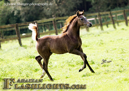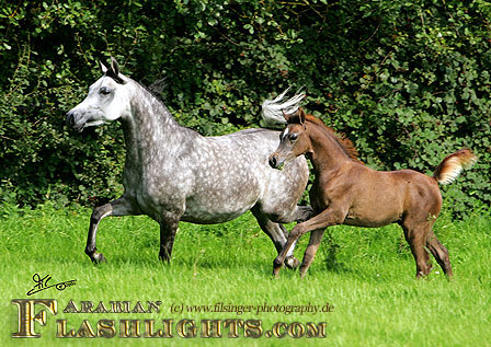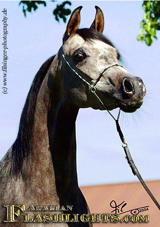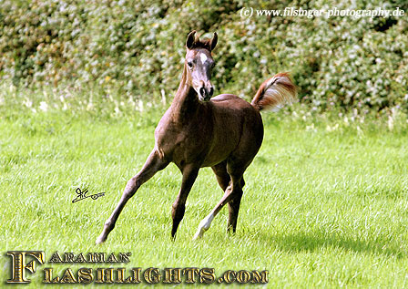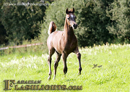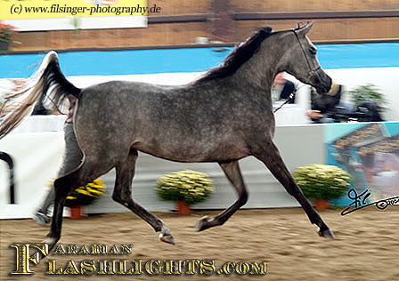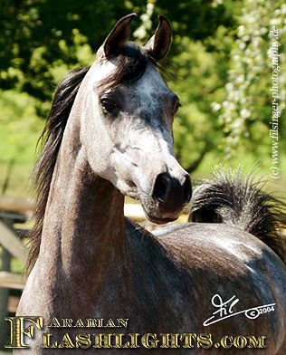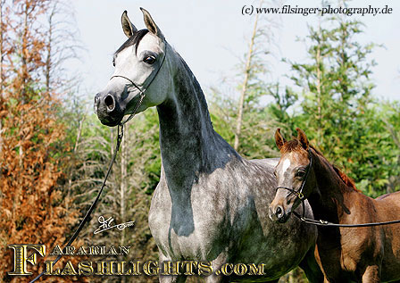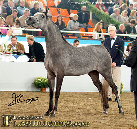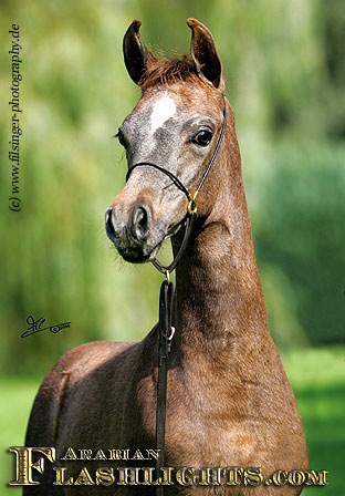 As to her quality, there was no doubt - DONNA DIVA was destinated to represent her breeder's 'Arabian Sun Horses' at international shows in Europe. And she did very well, always ranked in the top places of her junior age class. In the last year shown, in 2004, she became Champion Filly at the show in Balen, in Belgium, her home country. After two years of a life outside her home, well cared for, but in regular show training and show work in a training stable in Germany, DONNA DIVA went home end in February 2005. It was decided that she should have a rest from the show work, clearing her spirits and enjoying her life for some time in natural state and in the pasture at home, before she was bred. The Bentchikous wanted to see also her potential as a broodmare, and so, DONNA DIVA was bred to WH Justice in 2005, a stallion that Ingrid Bentchikou liked very much due to his beauty and front end. DONNA DIVA gave birth to her very first foal in 2006, a really cute little colt that gave a great hope to the breeders and owners. And so, he was named ASH DREAM OF GLORY - ASH as prefix for all horses bred in the future by 'Arabian Sun Horses', and the name of the colt expressing what the Bentchikous felt about him.