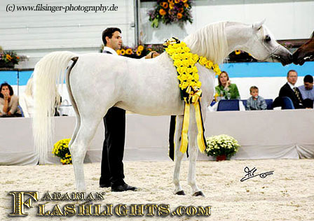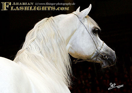 He is an extremely showy, expressive grey stallion making his show in full spirits each time when getting presented by his handler - ESCAPE IBN NAVARRONE. He is known meanwhile all over for his masculine and playful charisma, and his great show career. Coming from a most successful family and damline, he is born 1999 out of the most successful show and broodmare NAVARRONE "P", from Belgium. She carryies much Spanish blood, added to some Egyptian. Her paternal grandsire is the "golden cross" stallion IBN ESTOPA (by the straight Egyptian stallion, Shaker el Masri, out of the Spanish mare Estopa), a World Champion Stallion himself in 1988. ESCAPE's sire is A.S. SINANS PACHA, a son of famous straight Egyptian producer Ansata SINAN, and out of the former World Champion Filly SASKIA RJ, who comes from another "key cross" - the ASWAN son PLAKAT to the IRIDOS daughter, BARWNA. A combination that produced several World Champions, including SASKIA herself.