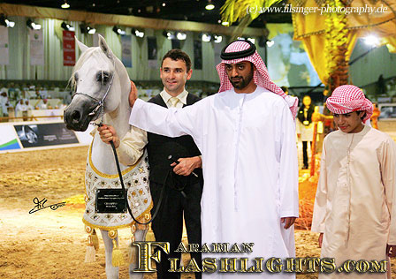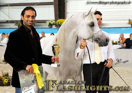Bred by Dion Arabians, Belgium, ESCAPE IBN NAVARRONE is owned by HH Sheikh Amar Bin Humaid Al Nuaimi, Crown Prince of Ajman, and owner of the famous Ajman Stud in the United Arab Emirates. Sheikh Ammar loves this white stallion, his type, his presence, and when he really shows off. "Not only was Escape's win my first World Championship, it was the first World Championship for the Emirates as well. I was very proud of that," he says. |