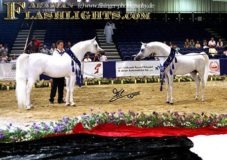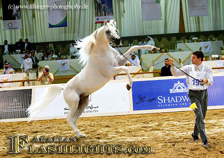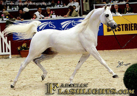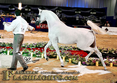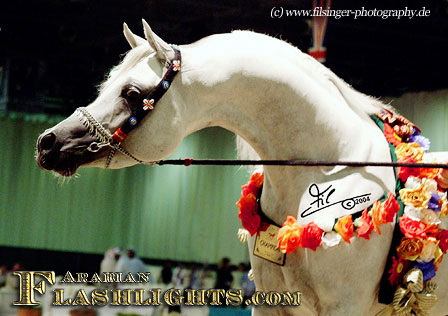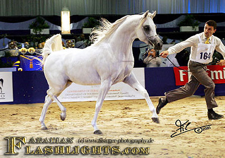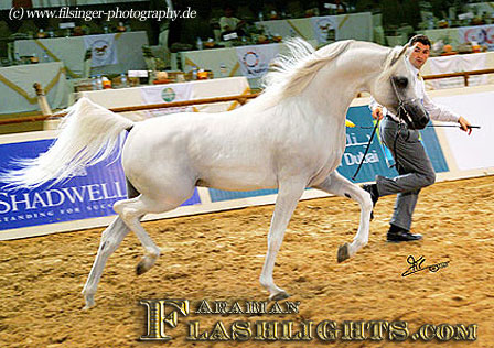 ESCAPE's show career started early, and his list of records and major titles is added to and increases each year. He was All Nations Cup Champion Colt and European Reserve Champion Colt as a Junior, was twice Dubai International Champion Stallion, and once reserve (just beaten by his maternal half brother, ETERNITY IBN NAVARRONE). He took the stallions' championships at the International Shows in Sharjah and Qatar, at the All Nations Cup in Aachen, and culminated with winning the World Championships in 2005.