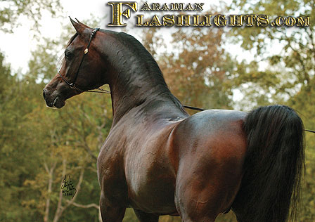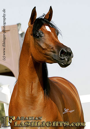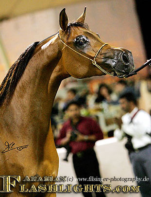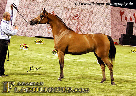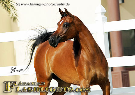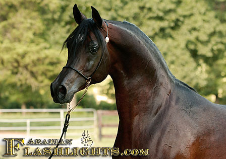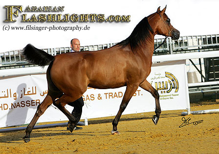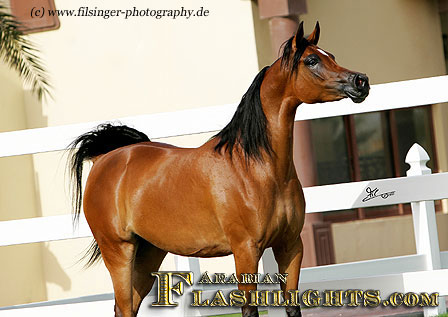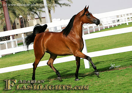- son of the straight Egyptian Ruminaja Ali son, the bay, Anaza El Farid, and out of Kajora, imported from the U.S. to Qatar by Al Shaqab Stud and infoal in 1994