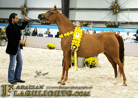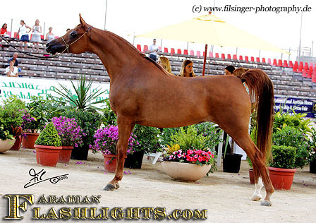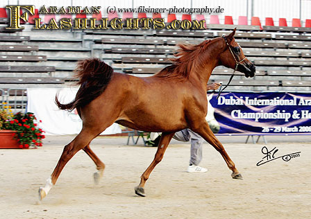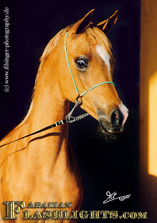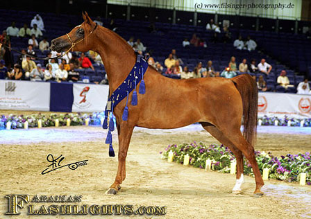 The 1993 born PSYCHES AMBER GEM started her great career in Europe when she came over from her place of origin and birth, the United States of America. Purchased and owned by the Calvet family of Shamilah Arabians, France, they showedher in 1995, when the two-year-old chestnut achieved straight away the titles as Nations Cup Reserve Champion Filly in Aachen, and World Champion Filly in Paris. After a rest of two years, the Calvets, very much focussed on shows, took her back to the showring as 4-year-old senior mare in 1997, and again, she made her input there, repeating the same titles at the two major shows she did win before, this time as senior. One year later, and after being 1998 Champion Mare in Menton, the tragic situation of the Calvet family caused the dispersal sale of all the horses of Shamilah Arabians. This way, PSYCHES AMBER GEM came to Uzama Alkazemi in Kuwait who acquired her with a bigger group of other horses from Shamilah Stud. In his most exquisite, lovely place of Ezzain Stud, located about an one hour drive outside Kuwait city, PSYCHES AMBER GEM found a wonderful new home. Her new owner never focussed on shows, so the mare made her life as broodmare, and living a life outside the shows. After some time, Uzama Alkazemi decided he favoured the straight Egyptians, and decided to get rid off all his other bloodlines. While PSYCHES AMBER GEM has a straight Egyptian mother and damline, on father's side she is a daughter of the famous PADRONS PSYCHE who carries Russian, Polish, Egyptian and Crabbet blood.