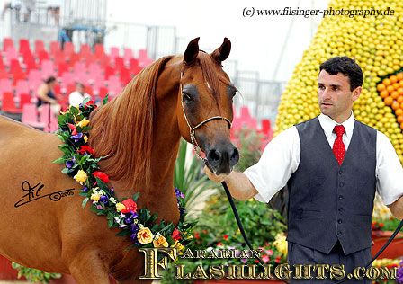 HH Sheikh Ammar Bin Humaid Al Nuaimi from Ajman, United Arab Emirates, heard about this, and called to Uzama Alkazemi to find out about his chestnut, former show mare. The result, a few weeks later, in early 2005, PSYCHES AMBER GEM had a new owner and a new home with Ajman Stud. She was 12 years then, still in great shape and quality, so there was no doubt for Sheikh Ammar - this mare would win in the big show ring again. Straight away he sent her to the major shows in the Middle East and PSYCHES AMBER GEM won in a straight row of three Champion Mare titles at the major International Show of the Middle East in 2005 - Dubai, Sharjah and Qatar. Sent to Europe then after, she continued with the Champion Mare title at the International 'A' show in Menton, and finalized as 2005 All Nations Cup Champion Mare in Aachen. There we saw a very happy and proud Sheikh Ammar receiving his trophy in Aachen and took with AMBER GEM's help and his other horses, the 'Nations Cup Trophy' for a very first time to the United Arab Emirates!