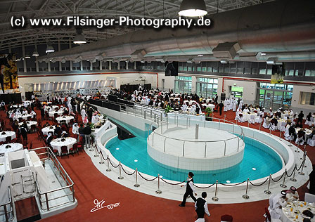 The tables and buffet were nicely set and decorated in one of the huge halls